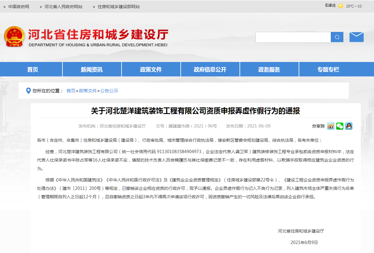 2021年6月9日,河北省住房和城鄉(xiāng)建設(shè)廳發(fā)布《關(guān)于河北楚洋建筑裝飾工程有限公司資質(zhì)申報弄虛作假行為的通報》