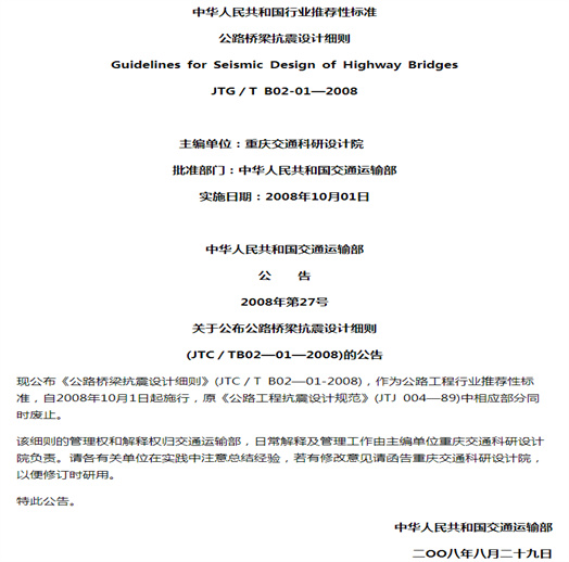 根據(jù)交通部《關(guān)于下達1999年度建設(shè)標(biāo)準(zhǔn)、規(guī)范、定額等編制、修訂工作計劃的通知》(交通部公路發(fā)[1999]82號),由重慶交通科研設(shè)計院組織對《公路工程抗震設(shè)計規(guī)范》 (JTJ 00489)橋梁抗震設(shè)計部分進行修訂,編寫《公路橋梁抗震設(shè)計細則》。