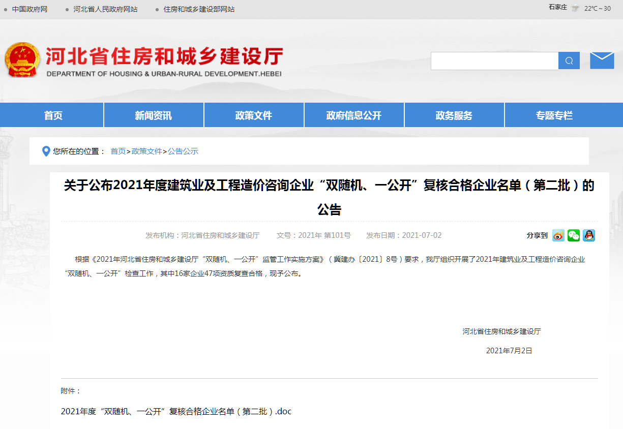 關(guān)于公布2021年度建筑業(yè)及工程造價(jià)咨詢企業(yè)“雙隨機(jī)、一公開(kāi)”復(fù)核合格企業(yè)名單(第二批)的公告
