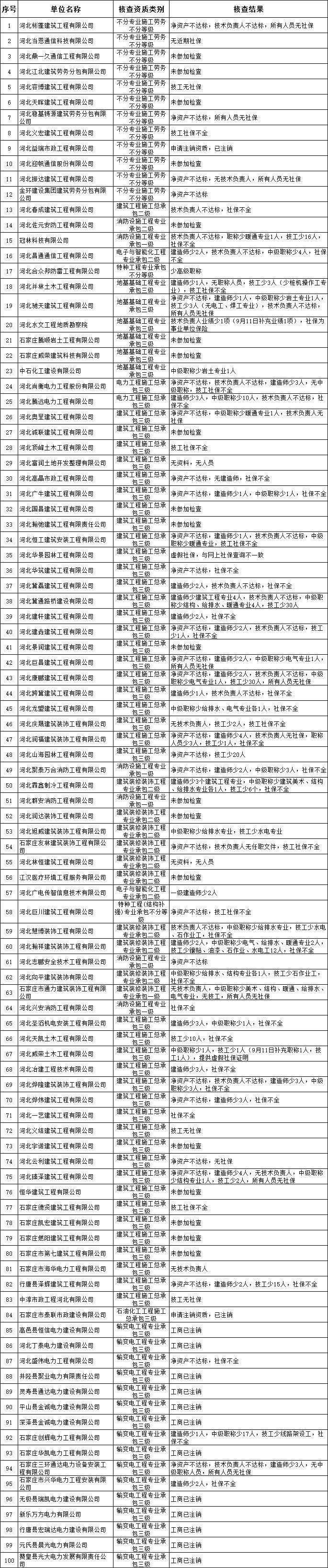 本次共核查了238家建筑業(yè)企業(yè),其中,41家達(dá)到資質(zhì)標(biāo)準(zhǔn)要求,197家不合格(含工商已注銷企業(yè)14家,申請(qǐng)注銷資質(zhì)企業(yè)4家,未參加檢查企業(yè)44家)。