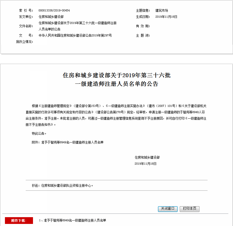 住房和城鄉(xiāng)建設(shè)部關(guān)于2019年第三十六批 一級(jí)建造師注冊(cè)人員名單的公告