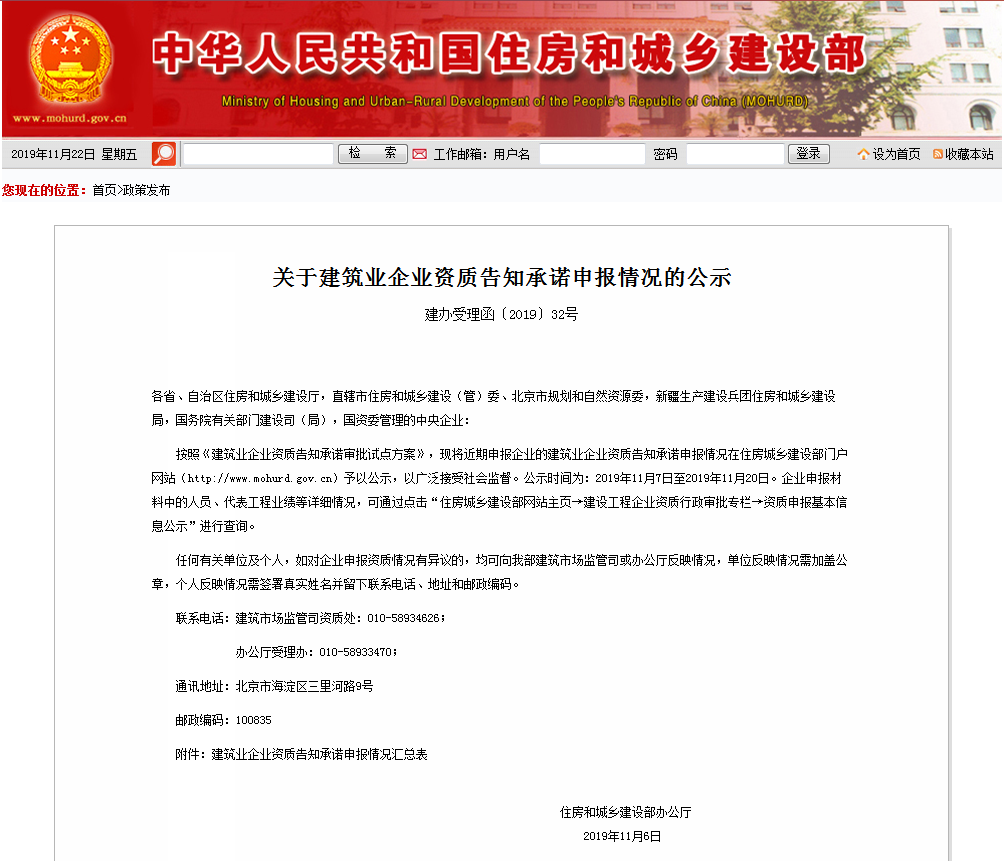按照《建筑業(yè)企業(yè)資質(zhì)告知承諾審批試點(diǎn)方案》,現(xiàn)將近期申報(bào)企業(yè)的建筑業(yè)企業(yè)資質(zhì)告知承諾申報(bào)情況在住房城鄉(xiāng)建設(shè)部門戶網(wǎng)站(http://www.mohurd.gov.cn)予以公示,以廣泛接受社會(huì)監(jiān)督。公示時(shí)間為:2019年11月7日至2019年11月20日。企業(yè)申報(bào)材料中的人員、代表工程業(yè)績(jī)等詳細(xì)情況,可通過點(diǎn)擊“住房城鄉(xiāng)建設(shè)部網(wǎng)站主頁→建設(shè)工程企業(yè)資質(zhì)行政審批專欄→資質(zhì)申報(bào)基本信息公示”進(jìn)行查詢。